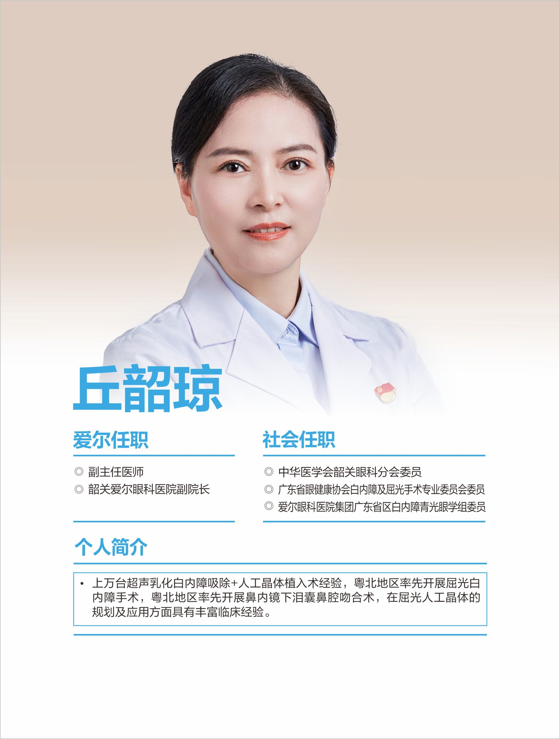 韶關愛爾眼科醫院有限公司白內障團隊擁王愛琴院長(愛爾眼科粵北區)、丘韶瓊院長、郭俊豪主任等多位專科醫生,具備同步國際的白內障手術能力,能熟練開展各項常規及疑難白內障手術。 可開展微切口煥晶白內障手術,植入多焦晶體或多焦+散光矯正晶體,在治療白內障同時同步解決遠視/近視、老花眼、角膜散光等屈光問題,醫生手術經驗豐富,為眾多患者帶來更舒適的視覺。